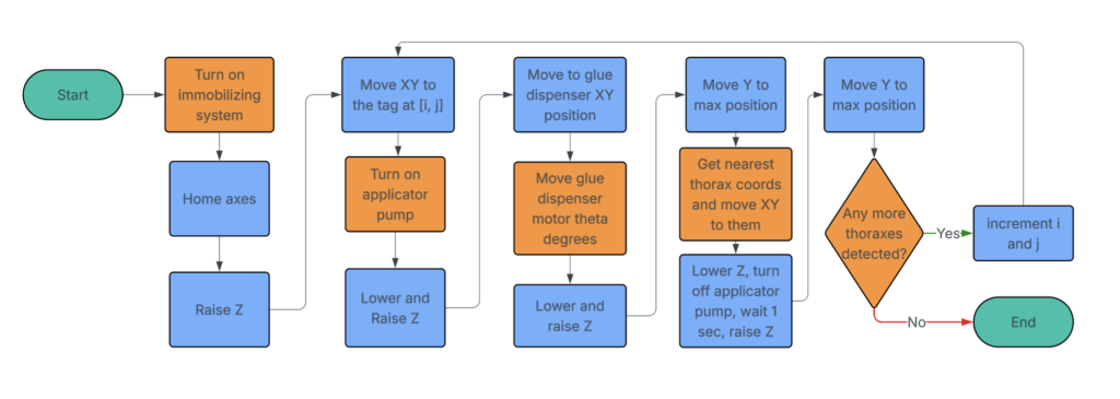 UIUC’s Robinson Lab conducts research that requires the studying of bees that are tagged with tiny 2x2mm “QR code” tags. Cameras are used to track the tags and analyze the behavior of bees (read more in this article by The Apiarist). Bee tagging is the process of applying these tags to the thoraxes of a large group of bees,  and manually tagging a colony one by one can take researchers 12+ hours!